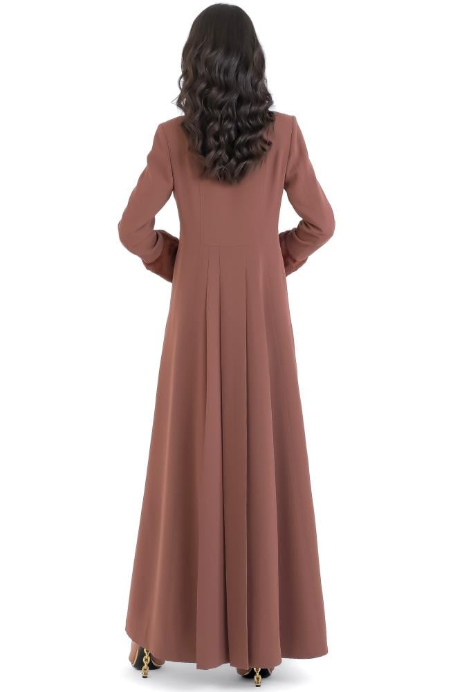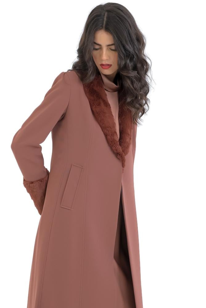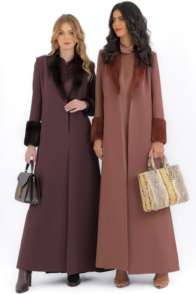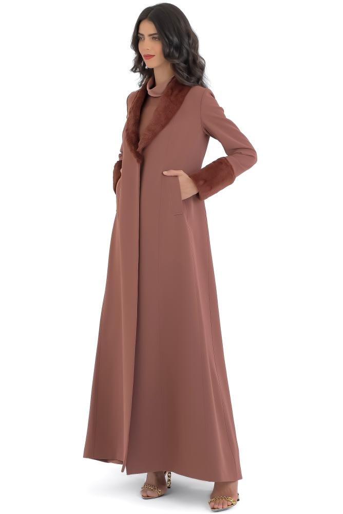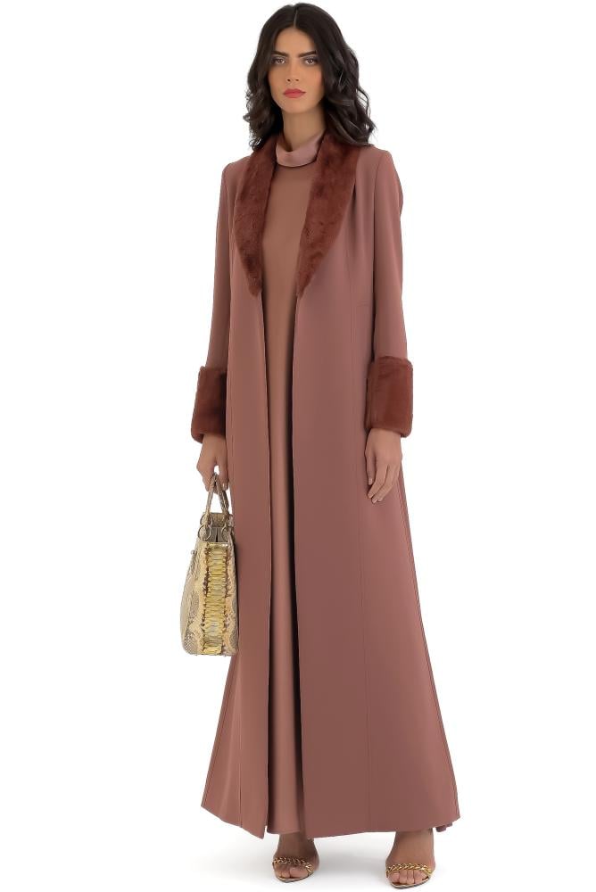 الستايل الفخم الراقي المزين بالفرو و بدون أزرار والخامة كريب عملي و يتحمل كثرة الاستعمال ومناسب للاجواء المعتدلة والباردة ومبطن بالكامل .