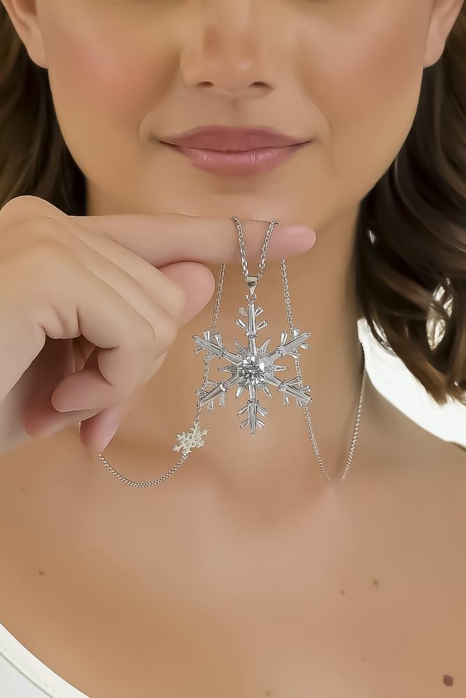 قلادة فضة مرصعة بالأحجار على شكل نجمة الثلج بتصميم مستوحى من جمال الطبيعة الباردة. هذه القلادة تحمل في تفاصيلها روعة ندفة الثلج، حيث تبرز النجمة الفضية بخطوطها المتقنة والأحجار البراقة التي تزينها، لتضفي لمسة من السحر على إطلالتك. تعتبر هذه القلادة خيارًا مثاليًا لإبراز ذوقك الفريد في كل مناسبة.