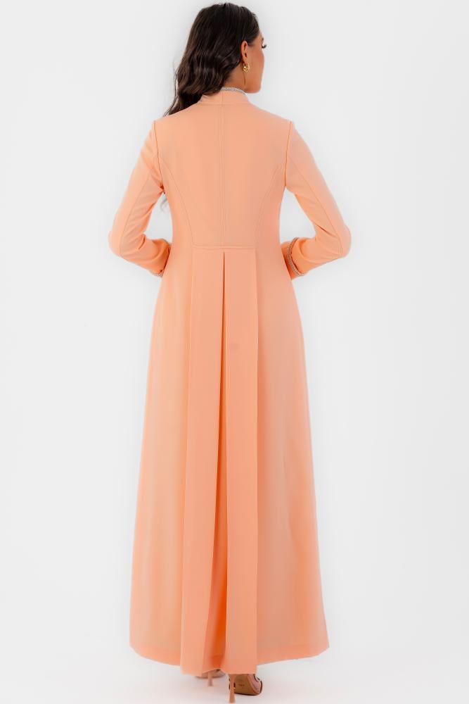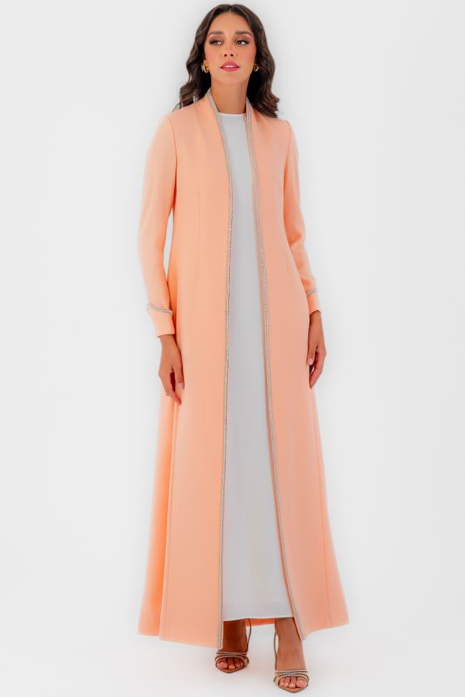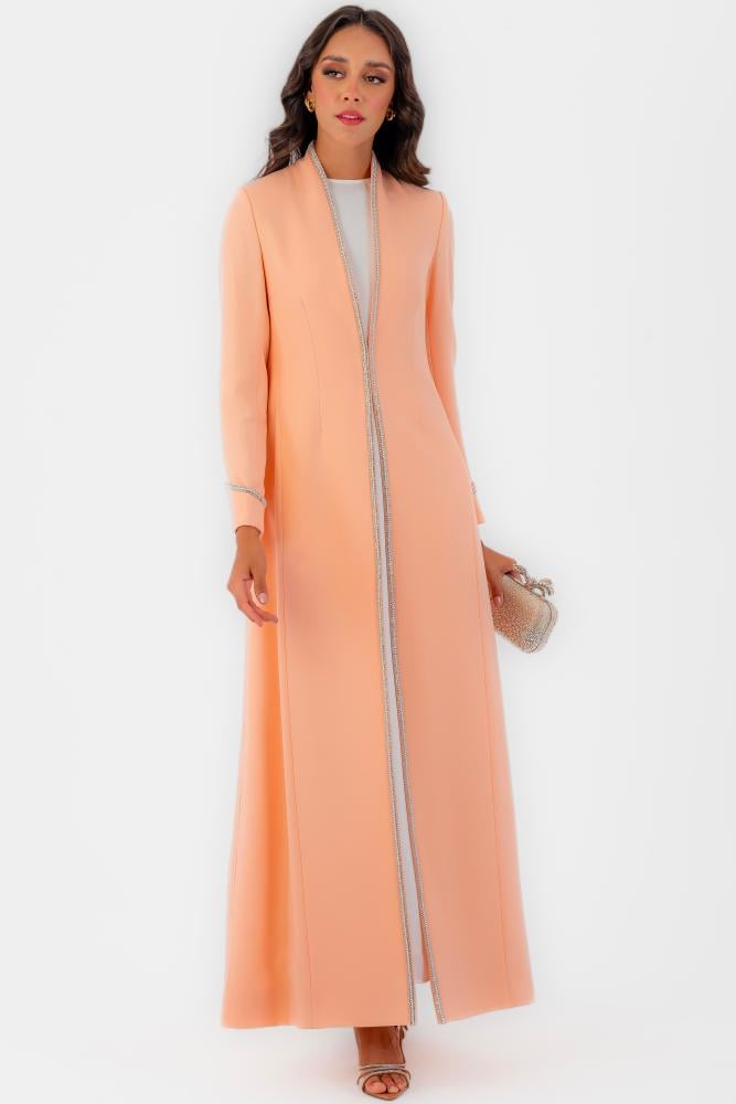 قطعة راقية مزينة بالشك اليدوي من اللؤلؤ والكرستال وبخامة كريب فاخرة وتتحمل كثرة الاستعمال والغسيل باليد .مناسبة للصيف ومبطنة من الامام ببطانة خفيفة .